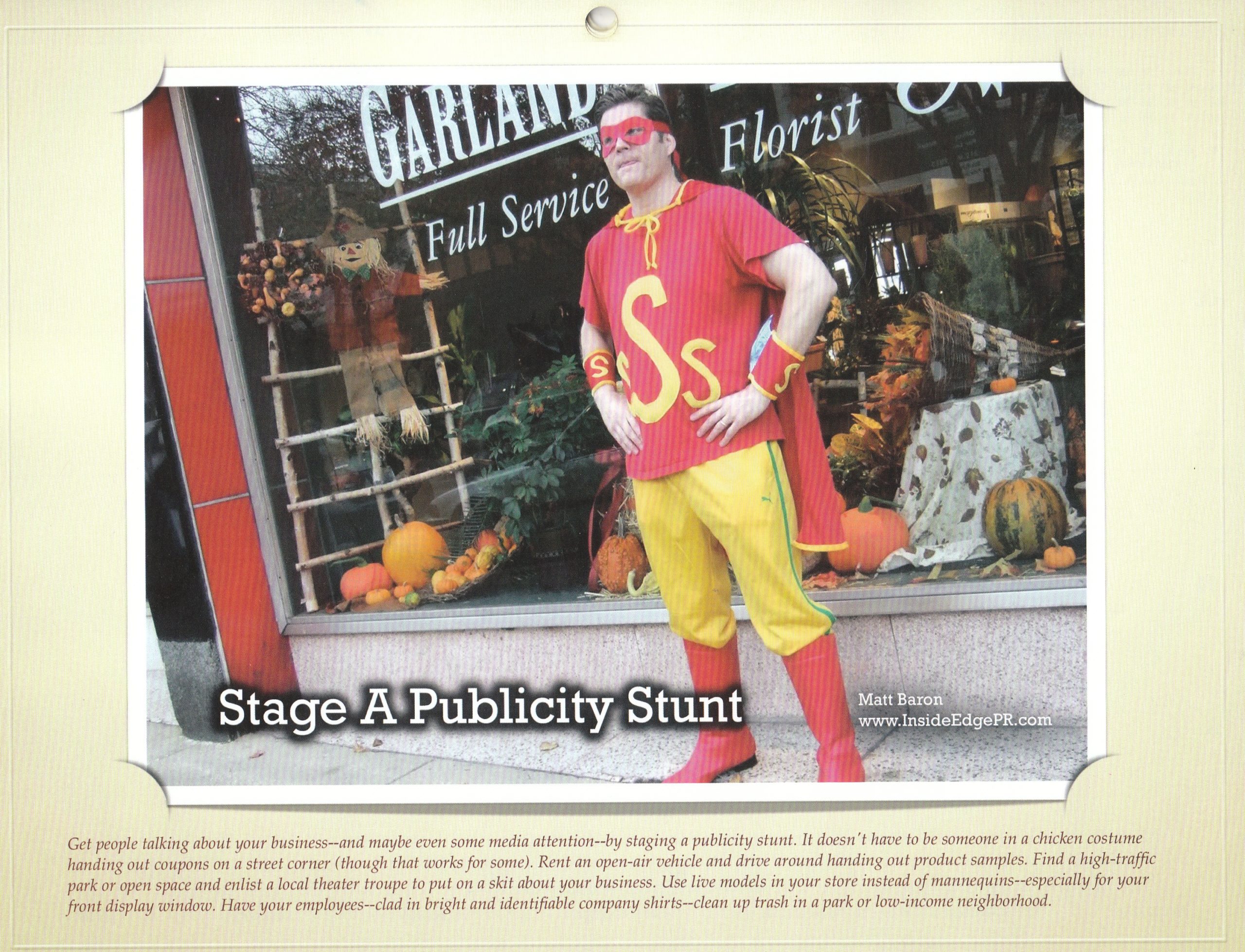Each of the 12 months includes an image depicting a creative way to grow your business. A sampling: January was “Start or Update Your Website,” May was “Write a Book,” and October will be “Sponsor School/Youth Sports Teams.”